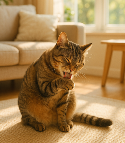 고양이의 피부에 이상이 생겼을 때도 과도한 그루밍이 나타납니다. 피부염, 알레르기 반응, 곰팡이 감염, 진드기, 벼룩 등의 외부 기생충이 대표적인 원인입니다. 이런 경우 고양이는 그루밍을 통해 가려움증을 해소하려 하며, 반복적인 핥기와 긁음으로 인해 피부 발적, 궤양, 탈모 등이 동반됩니다.