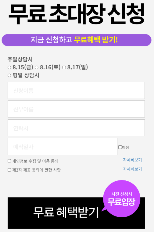 광복절 연휴와 맞물린 일정 덕분에 바쁜 예비부부도 부담 없이 참여할 수 있습니다. 지금 바로 사전예약을 통해, 예산도 아끼고 만족도도 높이는 결혼 준비를 시작해 보세요.